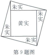 9. 赵爽弦图是一个以勾股形之弦为边的正方形。图中包含四个全等的勾股形和一个小正方形,其面积称为朱实和黄实。如图,设每一个勾股形的两条直角边长分别为 $a$ 和 $b$,若 $ab = 8$,且$a^2 + b^2 = 25$,则黄实为(