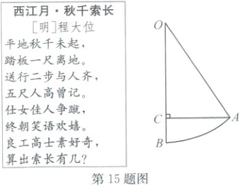 15. 明朝数学家程大位曾作词《西江月·秋千索长》。该诗词翻译后的示意图中,$OA$,$OB$ 表示秋千的绳索,$AC\perp OB$,$BC = 1$,$AC = 2$,则该秋千的索长 $OA =$