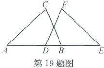 19.证明:因为AD=BE,所以AD+BD=BE+BD,即AB=DE。因为∠ADF+∠EDF=180°,∠EBC+∠ABC=180°,所以∠ABC=∠EDF,所以△ABC≌△EDF(AAS),所以AC=EF。