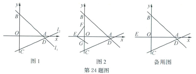 24. (12 分)如图 1,已知直线 $l_1:y = -x + 3$ 与坐标轴交于 $A$,$B$ 两点,直线 $l_2:y = \frac{1}{2}x + b$ 与直线 $l_1$ 相交于点 $D(\frac{10}{3},m)$,与 $y$ 轴交于点 $C$。
