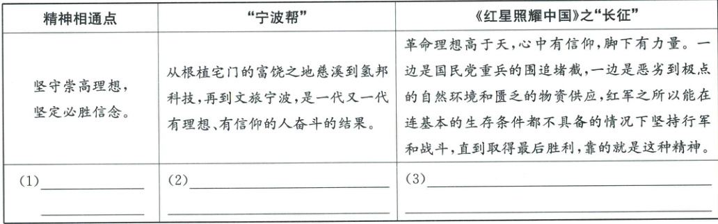 9.同学想梳理“宁波帮”精神和“长征”精神的内在相通之处。请结合材料及《红星照耀中国》整本书,再提炼一个精神相通点并分别用具体事例完成下表。(4分)