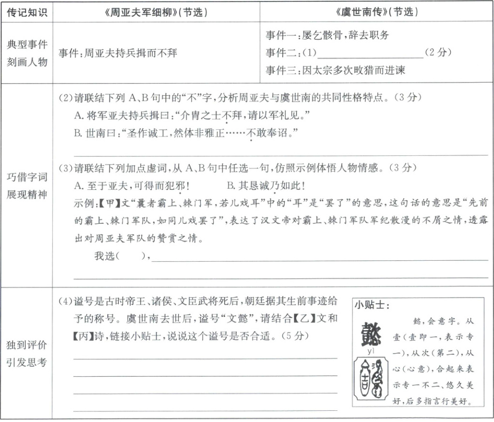 (2)周亚夫面对皇上劳军仍严守军纪,虞世南因诗体不雅正不愿赓和作诗,体现了二人刚正不阿的共同性格特点。