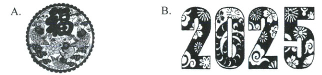 9.示例一:A 窗花中有莲蓬(莲子)图案,寓意多子多福;盛开的荷花,寓意和谐美好;鲤鱼图案,寓意吉祥如意;正上方的福字,寓意幸福美满。 示例二:B 窗花由数字2025组成,表明这是2025年的春节窗花;数字中有蛇的图案,寓意2025年是蛇年;数字里有祥云、莲花、烟花等图案,寓意吉祥如意,喜庆热闹。