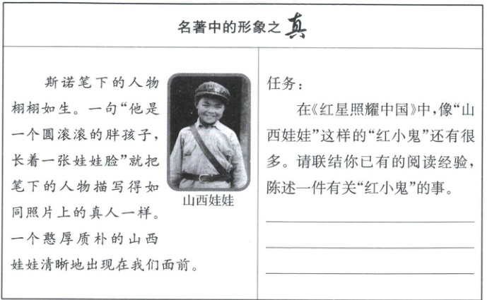 在《红星照耀中国》中,像“山西娃娃”这样的“红小鬼”还有很多。请联结你已有的阅读经验,陈述一件有关“红小鬼”的事。