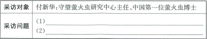 3. 2024年赏萤季开始筹划了。为了减少对萤火虫的伤害,研学小组准备向付新华博士进行采访。请你结合材料四帮助设计两个问题。