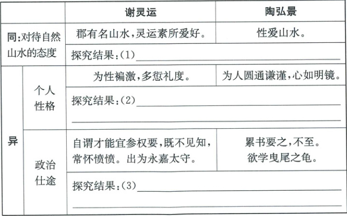 (2)谢灵运性格褊激,多违礼度,不受重用,内心忧愤,只能归隐借山水遣怀;陶弘景处世灵活变通,又谦虚谨慎,内心如同明亮的镜子一般清醒、通透,归隐山林,醉心山水。(写出两个人的性格即可)
