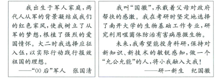 32.(16分)(1)①张国清受红色家风的影响确立了从军梦,启示我们树立人生目标,应当从自身实际出发。(3分) ②纪徽立志做一个“允公允能”的人,启示我们树立人生目标,应当与国家、民族和人民的利益相结合。(3分) (2)示例:成为一名语文老师。(2分) 考入理想高中及师范院校。(2分) 努力学习、广泛阅读,积累必备知识,提升专业素养,积极参与活动,提高演讲沟通能力。(2分)(言之有理即可)