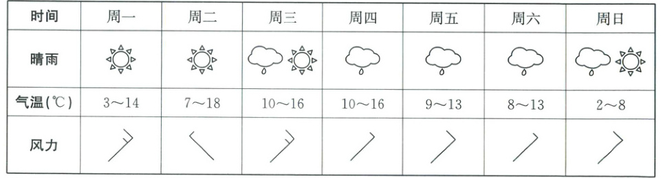 (1)周二。理由:周二为晴天,无降水;气温7~18℃,温度适宜;风力较小,适合登山活动。