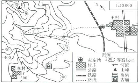 (2)线路①。理由:线路①经过的等高线较稀疏,坡度较缓,登山更省力;且路线相对平缓,行进更省时。