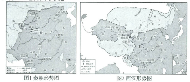 (1)比较图 1 和图 2,指出西汉开始对哪一地区进行有效管辖并用相关史实加以说明。通过读图,概括获取历史地图信息的方法。(6 分)