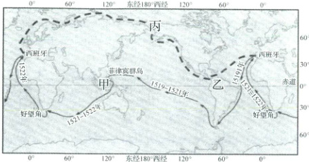彼此相通。(4)弟弟读完麦哲伦船队环球航行的故事后,充满钦佩,自己设计出一条虚拟航线,该航线经过乙
