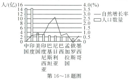 2023 年 7 月 11 日是第 34 个世界人口日。图为“2022 年人口数量排名前 10 位国家的人口数量及自然增长率图”。读图,完成第 16~18 题。