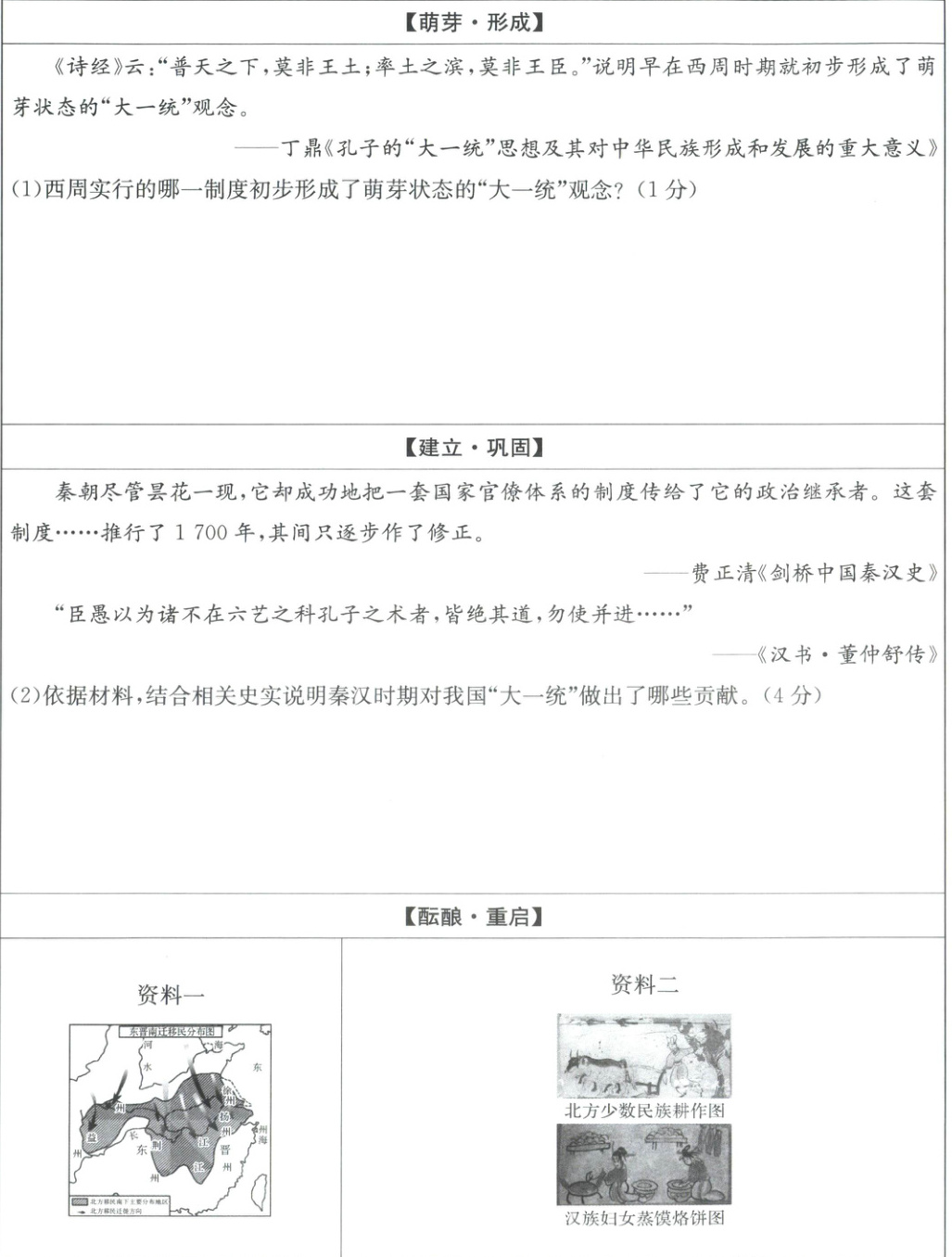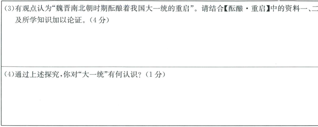 (3)有观点认为“魏晋南北朝时期酝酿着我国大一统的重启”。请结合【酝酿·重启】中的资料一、二及所学知识加以论证。(4 分)