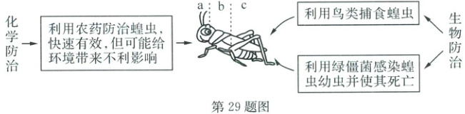 29. (8 分)“蝗虫过境、寸草不生”,自然界最可怕的虫灾是由蝗虫引起的。马世骏院士是我国生态学研究的奠基人之一,他在综合防治蝗灾方面做出了巨大贡献。下图列出了综合防治蝗灾的部分措施。据图回答问题。