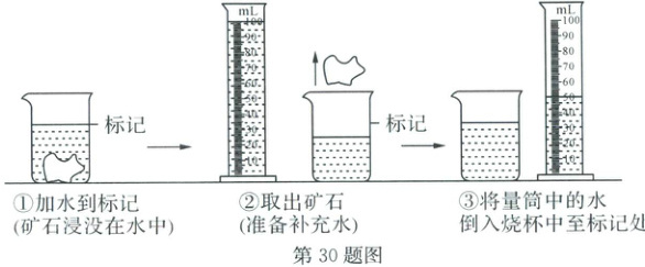 30. (8 分)某同学想测一块形状不规则也不吸水的矿石的体积,因矿石较大,放不进量筒,因此他利用一只烧杯,按图所示方法来测量矿石的体积。