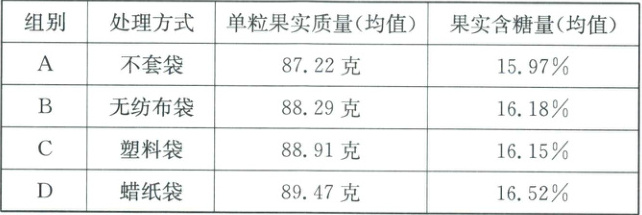 (3)上述实验数据表明,实施套袋技术可在一定程度上提高葡萄果实的品质,并且选用