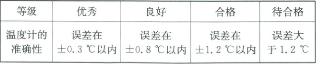 (3)【评价】用自制温度计测量$30\ ^{\circ}C$的温水,显示细管中液面在距离$0\ ^{\circ}C$刻度$14.5\ cm$处。根据以下评价表,评价此温度计属于哪一等级并简要说明原因:____。(4分)