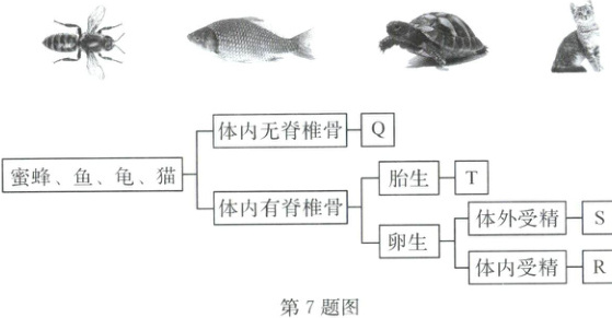 7. (2025·宁波镇海)小科对图中四种动物进行分类,并用表解形式编制了二歧分类检索表。以下空格字母能表示猫的是(