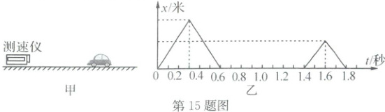 15. (2025·德清)交通部门常用测速仪来检测车速,测速原理是测速仪前后两次发出并接收到被测车反射回的超声波信号。再根据两次信号的时间差,测出车速,如图甲。某次测速中,测速仪发出与接收超声波的情况如图乙所示,x表示超声波与测速仪之间的距离。则下列说法中错误的是(假设超声波的速度为340米/秒,且声速与车速均保持不变)(