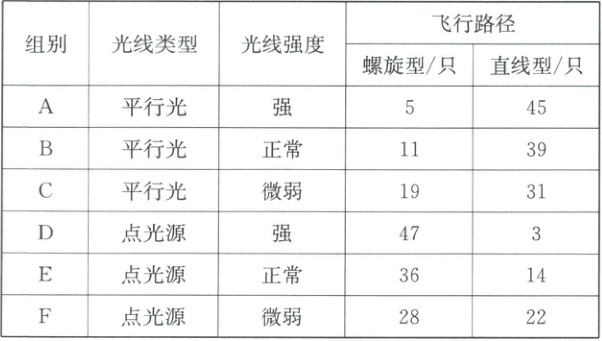 (2)光线类型和光线强度对飞蛾飞行方向的影响