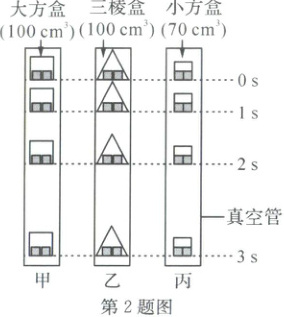 【实验】如图所示,用真空管模拟月球表面没有空气的环境。将等量沙包放入不同的盒内,依次进行了甲、乙、丙三次实验,物体在0s时由静止落下,利用频闪摄影记录了物体在0s、1s、2s、3s时的位置。
