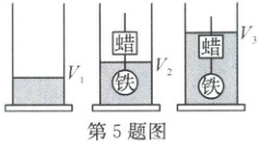 5. (2025·余姚)实验室在测固体密度时,需用量筒测出固体的体积,如果固体的密度小于水,就不能在水中下沉,我们常用如图的“沉坠法”测出它的体积。如图所示是用量筒测量蜡块(注:蜡块的密度小于水)体积的过程,则蜡块的体积为($V_1$、$V_2$、$V_3$为当前水和水中物体的总体积) (