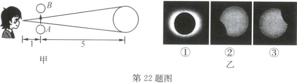 ,当小球在同一水平高度从 A 位置移动到 B 位置的过程中就可观察到模拟“日食”现象。(2)图乙是某次日全食发生时拍摄的三张照片,按发生过程先后,正确顺序是