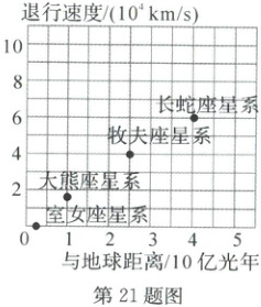 21. 人类对宇宙的探索从未停止。如图为不同星系的退行速度与它们跟地球距离的关系,据此可得出的规律是