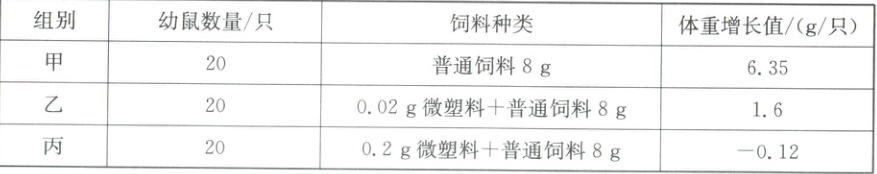 24. (6 分)微塑料是指直径小于 5 毫米的塑料碎片和颗粒,会威胁生物生长。为了研究微塑料对生物的影响,兴趣小组利用幼鼠进行了相关的研究,实验操作及结果如下: