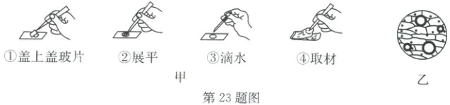 23. (6 分)同学们开展了制作植物细胞模型的活动。活动前,小科制作洋葱鳞片叶内表皮细胞装片并用显微镜进行观察。