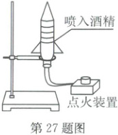 27. (6 分)在火箭模型制作大赛中,某小组设计制作了一款酒精燃料动力火箭发射装置,如图所示,先用喷雾器在瓶中喷入适量酒精,按下开关,触发点火装置,火箭就可以升空了。如何让火箭模型发射到更高的高度呢?小组同学进行了实验研究。