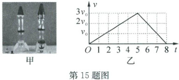 15.D 解析:根据图乙知,水火箭在第5秒时速度达到最大,故A正确;根据图乙可知,水火箭在第8秒时速度减小到零,此时达到最高高度,故B正确;根据图乙可知,水火箭0~5秒时速度不断增大,故C正确;根据图乙可知,水火箭5~8秒时速度不断减小,但是还是在向上飞行,故飞行高度是不断增加的,故D错误。故选D。