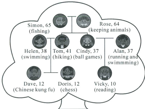 )28. Which of the following sentences is TRUE about Doris’ family?A. Cindy and Alan love playing sports. B. Simon and Rose are of the same age.
