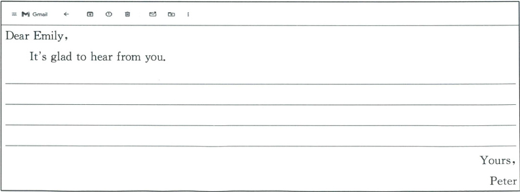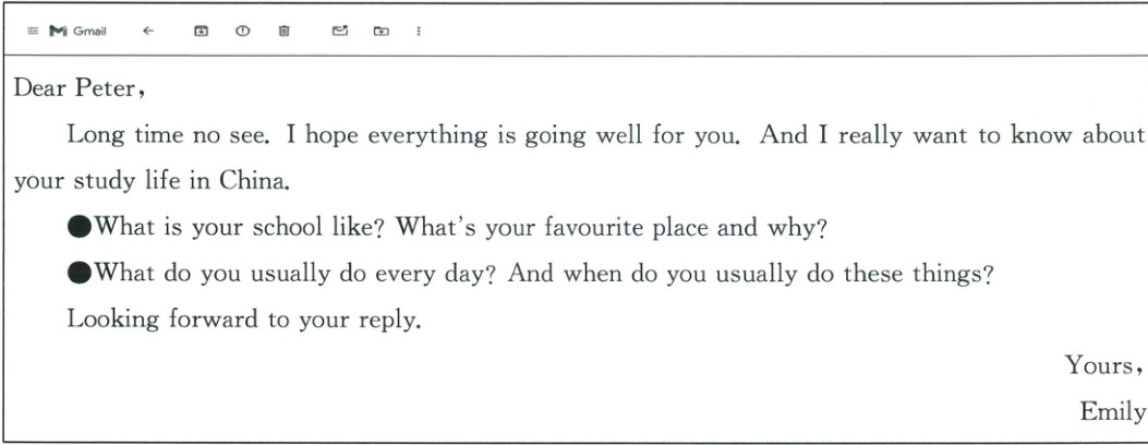 放学后,Peter 打开手机,发现自己收到了来自伦敦好友 Emily 的电子邮件。请以 Peter 的身份,阅读邮件后给 Emily 回信。