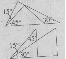 18. (4分)(2025·义乌)用一副三角尺构造$15^{\circ}$角的方法有很多,请你画出其中两种不同的构造方法,并在图上作出必要的标注,不写作法.