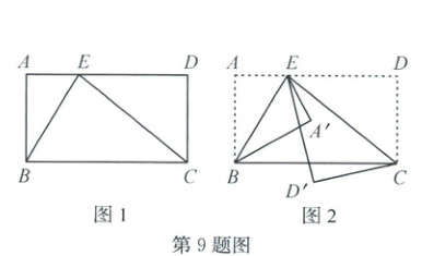 9. (2024·诸暨)如图 1,在长方形 ABCD 中,点 E 在 AD 上,并且∠BEA=$64^{\circ}$,分别以 BE,CE 为折痕进行折叠并压平,如图 2,若图 2 中∠A'ED'=$14^{\circ}$(∠AEA'>∠AED'),则∠DEC 的度数是