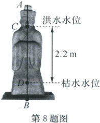 8. (2025·苍南)都江堰李冰石人的肩部和脚部通常被用作测量水位(如图). 洪水水位 C 与枯水水位 D 分别位于整尊石人 AB 的六等分点处,AC=BD(AC<CD),已知 CD=2.2 m,则整尊石人 AB 的高度=