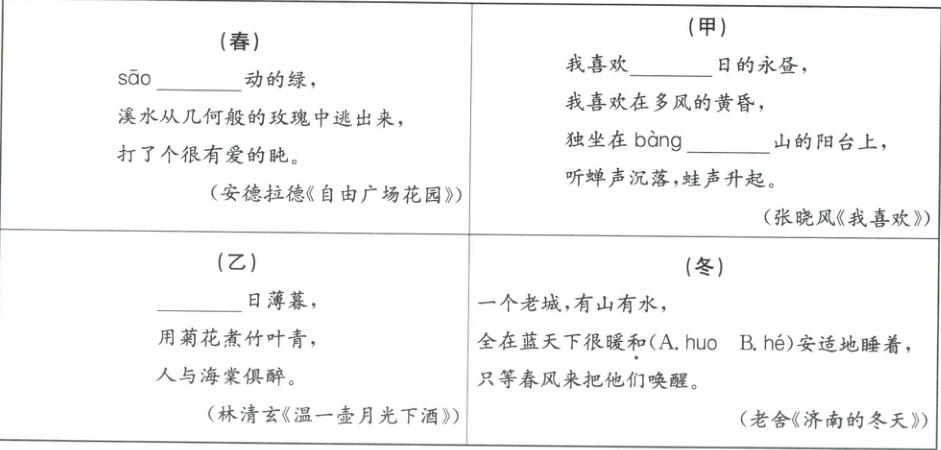 (3) 根据语境,写出(甲)(乙)文段里对应的季节。(2 分)