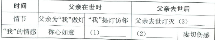 正月十五到了。这天是我的生日。(2)走在冷寂的大街上,忽然发现一个苍老的卖灯人。那灯是六角形的,用玻璃做成的,玻璃上还贴着“福”字。我立刻想到了父亲,正月十五这一天,父亲的院子该有一盏灯的。