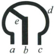 35. 如图是一种调节音量的电路元件结构示意图,$a$、$b$、$c$是固定的铜片,$d$是一段弧形电阻,$e$是滑动触头。为了使$e$顺时针转动时电路电阻增大,应该将该元件的铜片$b$和铜片