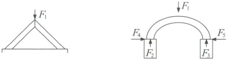 。图中的弧形拱结构受到向下的压力时,拱的各部分相互挤压