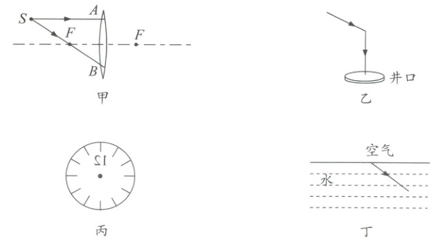 (4)一条光线照射到水面发生反射和折射,这条光线经水面折射后的光线如图丁所示。请画出它的入射光线和反射光线的大致方向。