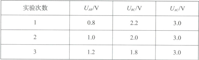(3)用电压表分别测出A与B、B与C、A与C两点间的电压为Uₐ₈、Uᵦc、Uₐc。经过多次实验,得到的数据记录在下表中。分析实验数据,你可得到串联电路的电压特点是