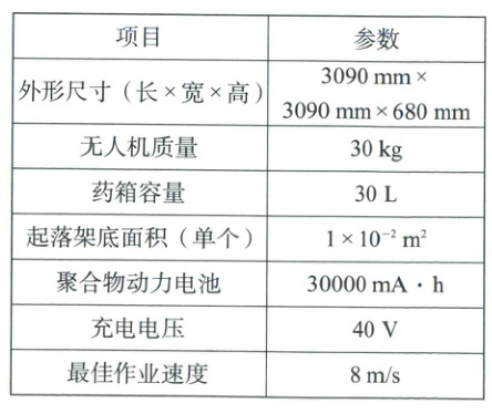 6. (6 分)植保无人机因其操控简单、喷洒均匀、省时高效等优点,在现代农业中发挥着重要作用。某型号双起落架植保无人机的项目参数如下表: