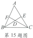 15. 如图,在△ABC中,BE,CF分别是∠ABC和∠ACB的平分线。若∠ABC = 66°,∠ACB = 58°,则∠FDB的度数为(