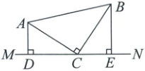 3. (8 分)在△ABC中,∠ACB = $90^{\circ}$,AC = BC,直线MN经过点C,且AD⊥MN于点D,BE⊥MN于点E。求证:DE = AD + BE。