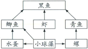 (2) 食物 4 小球藻→虾→黑鱼 (或小球藻→鲫鱼→黑鱼)