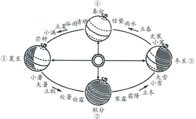 32. “风雷送暖入中春,桃柳着装日日新。赤道金阳直射面,白天黑夜两均分。” 此诗中描写的节气位于图中(