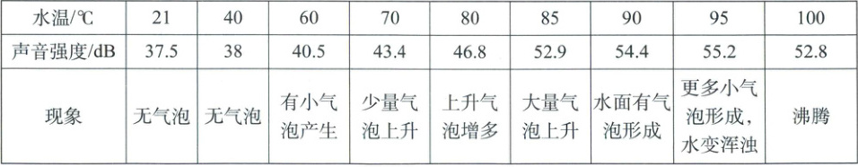 3. (5分)分析表中“水温、声音强度”的相关数据及对应的现象,你对“响水不开,开水不响”这句话有什么新的理解?