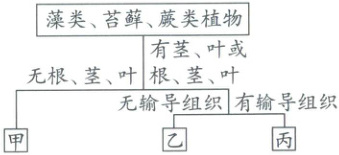 14. 某同学构建了一个关于藻类植物、苔藓植物、蕨类植物特点的分类关系图(如下图)。图中的甲、乙、丙依次代表(